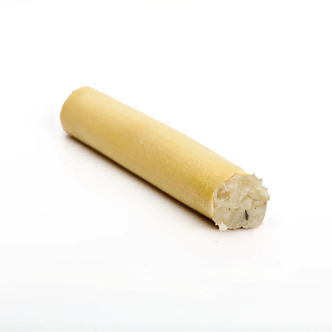 RELLENO: Fritura de bacalao 54% (Bacalao 75%, cebolla, aceite de oliva y ajo), bechamel, ajo asado, aceite de oliva y almidón de maíz y sal.