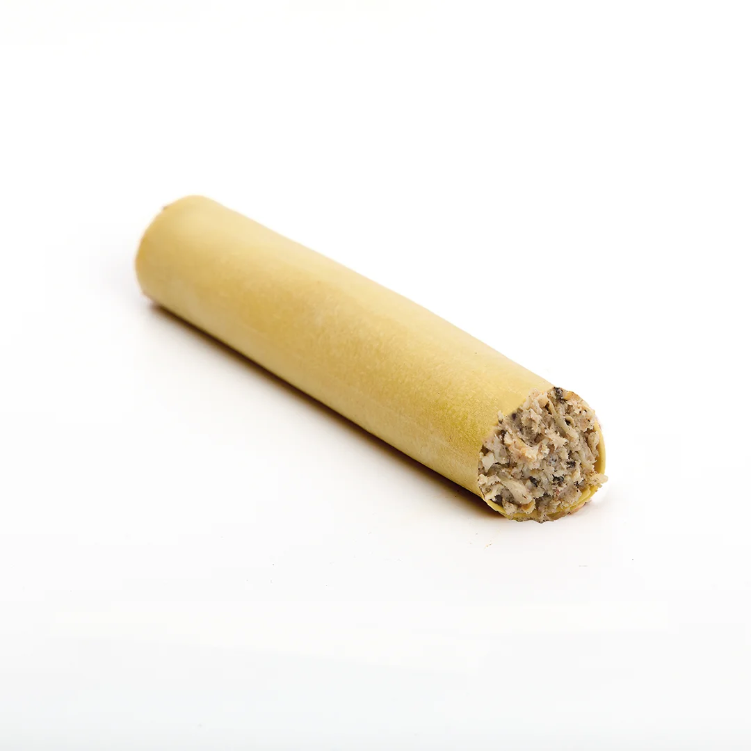 RELLENO: Pollo asado 51%, bechamel, pasta de setas y trufa negra 3 %, seta trompeta de la muerte, almidón de maíz y sal.